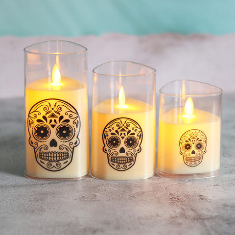 ไฟ LED ฮาโลวีนหัวกระโหลกแนวสยองขวัญขวดโหลเทียนทรงสามเหลี่ยมตกแต่งในร่มไฟปาร์ตี้เคลื่อนไหวได้ตามต้องการ