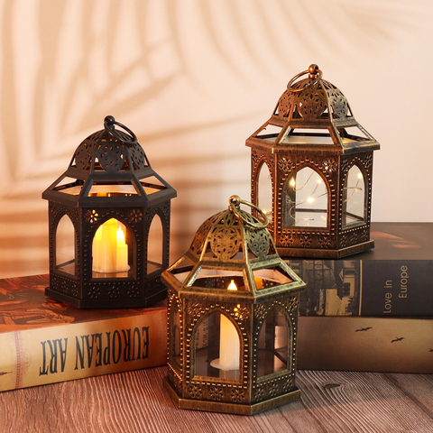 โคมไฟ LED ทรง2025สไตล์วินเทจสีน้ำตาลทองใช้แขวนตกแต่งมุสลิมรอมฎอนทรงหกเหลี่ยม
